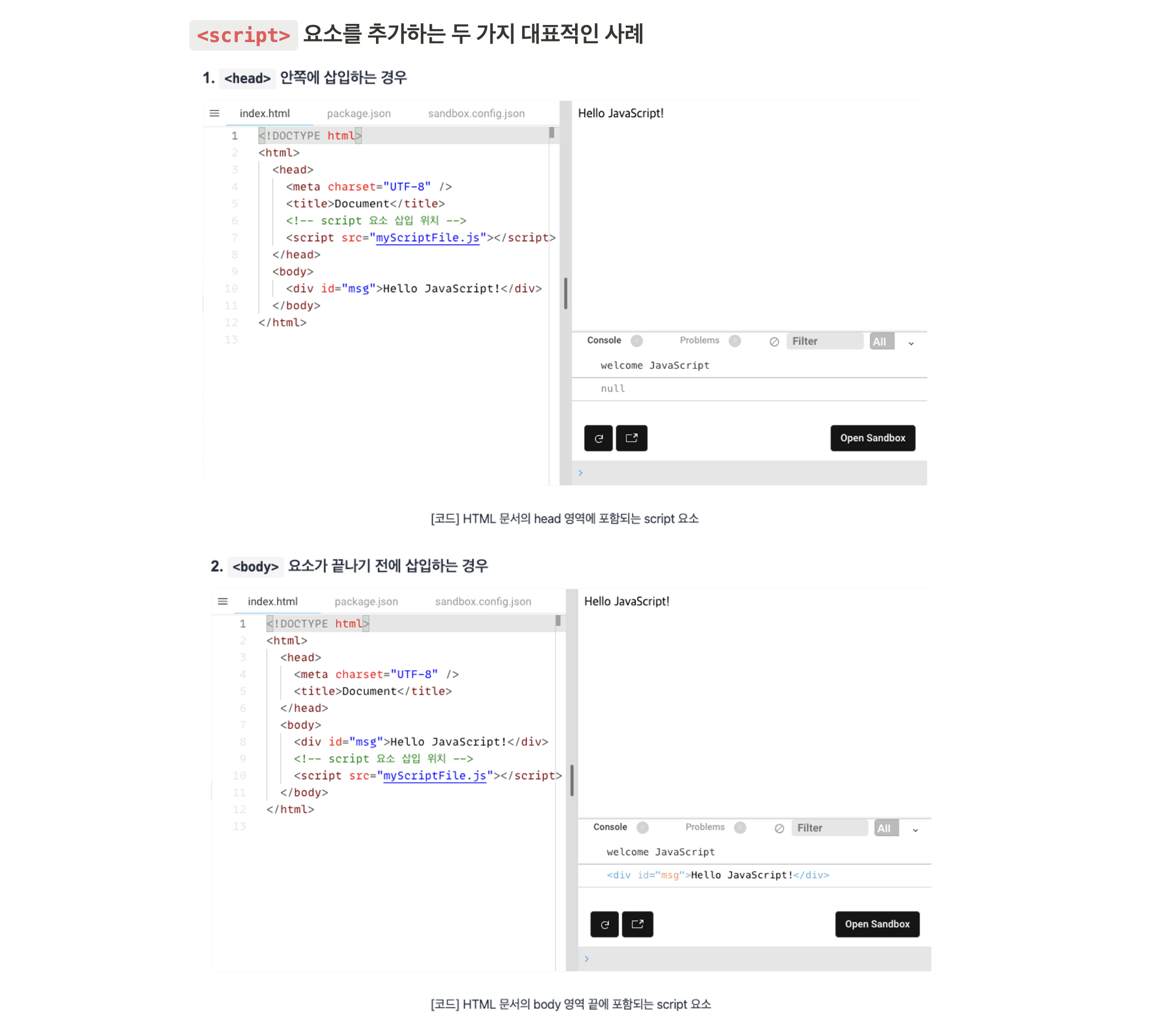 두 방식 모두 myScriptFile.js 내의 첫 번째 console.log를 성공적으로 출력하지만, 두 번째 console.log의 경우 제대로 출력하지 못하는 예시가 있다.