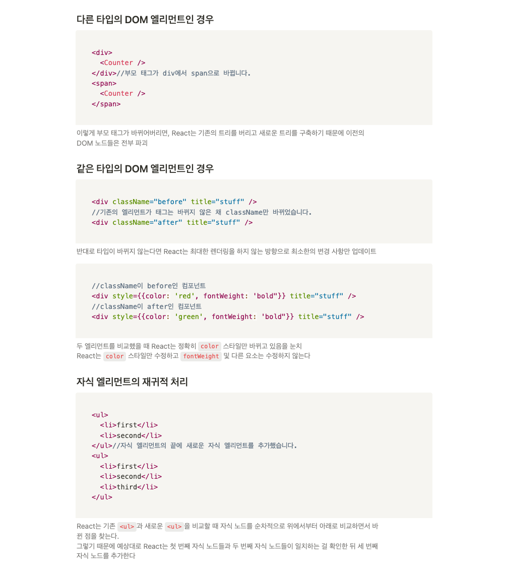 3. 변경된 내용이 화면에 새롭게 그려지기 이전, 실제 DOM이 변경되기 이전에 리액트는 두 개의 가상돔을 비교해서 정확히 어떤 부분이 바뀌었는지 효율적으로 비교하여 파악한다 >> 이러한 과정을 Diffing이라 한다